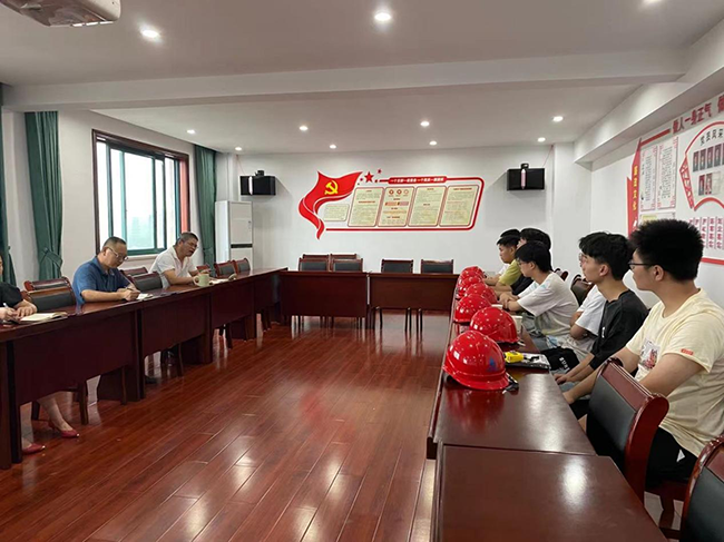 2021年6月30日上午在公司十二楼会议室召开金华市技工学校“华杰”班毕业生入职见面会。公司董事长吴晓、副总经理徐宏伟、行政部主任陆惠芬和七位新入职员工参加了会议。