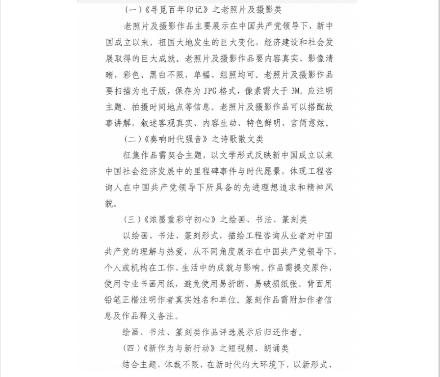 为庆祝中国共产党建党100周年,根据省工程咨询协会《关于开展“庆祝建党100周年文艺作品展示活动”初评推荐工作的通知》(浙咨协[2020]33号)的精神,我单位将协助开展书画摄影文学艺术作品甄选报送工作,现将有关事项通知如下: