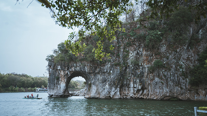 第四站,最具桂林市山水代表、城市象征城徽----象鼻山,又名象山,位于漓江与桃花江交汇处,山就像一头大象站在漓江边饮水。栩栩如生,引人入胜,山体前部的水月洞,弯如满月,穿透山体,清碧的江水从洞中穿鼻而过,洞影倒映江面,构成“水底有明月,水上明月浮”的奇观。它被誉为桂林市的市徽,也是桂林独特“香山水月”景观的源头。